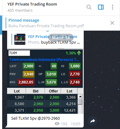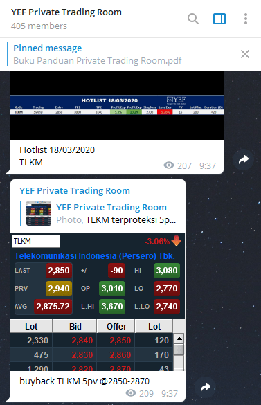 Sebagai contoh, hari ini kami trading saham $TLKM. Padahal sebelumnya saham ini sempat turun ke 2760, namun kami berikan instruksi beli bagi member Private Trading Room (PTR) di harga 2850 pada jam 9:37 dengan alokasi 5% portofolio atau sekitar 200 lot.