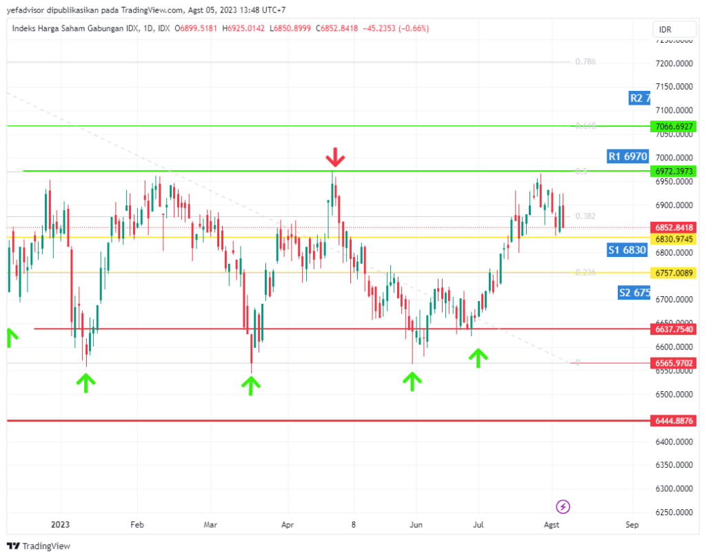 Pada perdagangan minggu lalu IHSG masih melanjutkan proses konsolidasi menguji mid area 6830an.