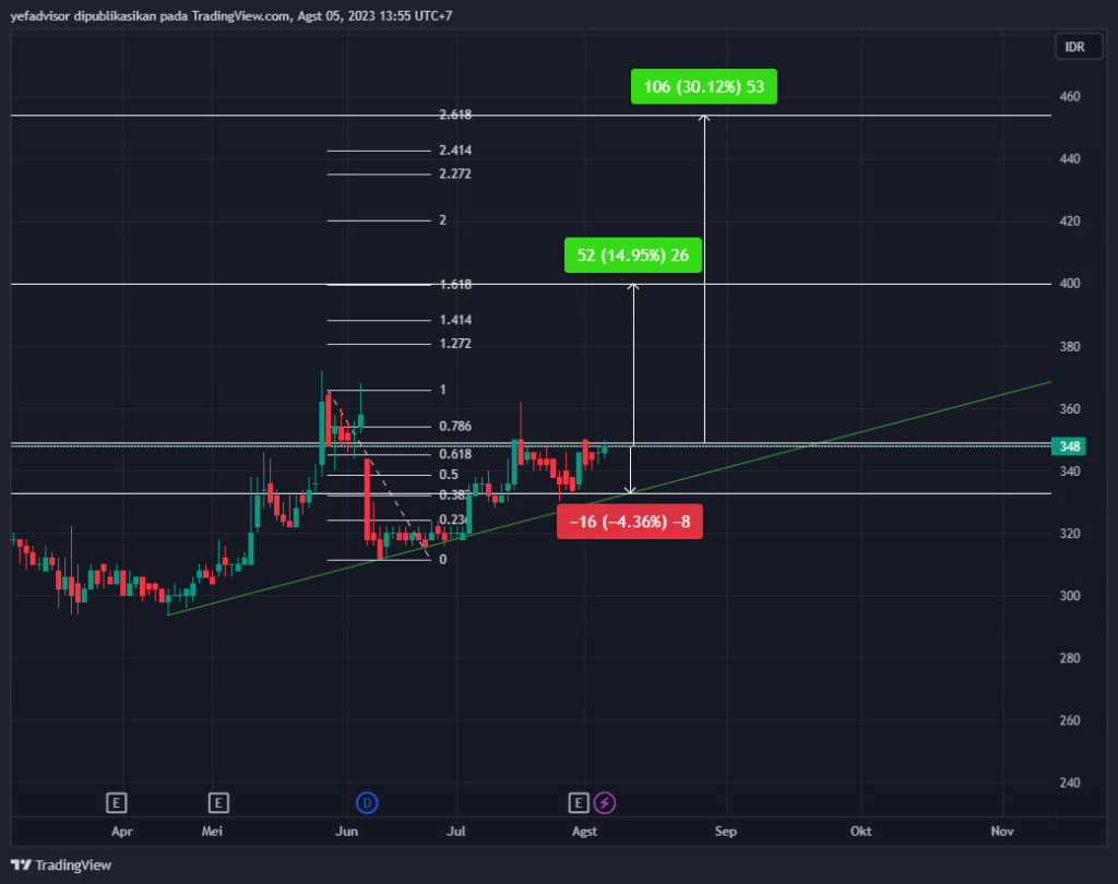 Ini adalah saham yang paling menarik untuk ditradingkan minggu ini. Terkonfirmasi lanjutkan uptrend dengan potensi upside minimal 15% hingga 30%. Menariknya risk kurang dari 5%.