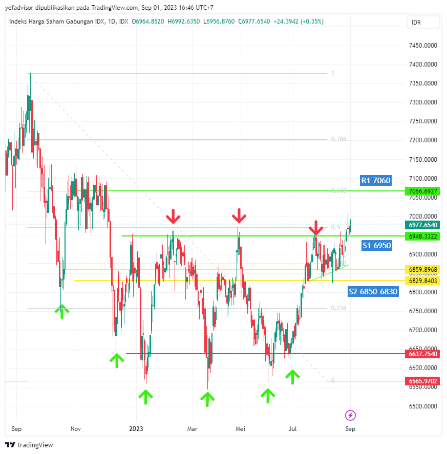Minggu lalu IHSG berhasil naik dan tutup diatas resist 6950 sesuai prediksi Stockcall edisi 27 Agustus 2023