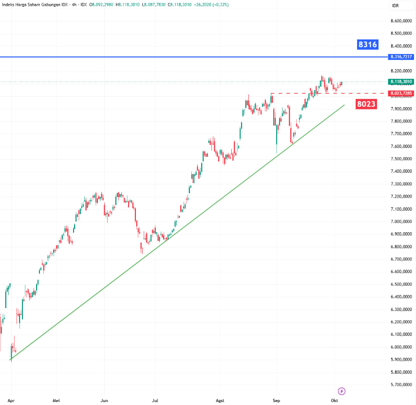 Masih sejalan dengan prediksi kami di Stockcall edisi minggu lalu, pekan ini IHSG berpotensi melanjutkan penguatan dengan target di level 8.316. Momentum ini turut ditopang oleh musim rilis laporan keuangan kuartal III 2025 yang menjadi fokus utama investor, dengan potensi memberikan dorongan positif apabila hasil kinerja emiten sesuai atau bahkan lebih baik dari ekspektasi. Secara historis, bulan Oktober juga dikenal sebagai periode penguatan IHSG secara statistik, meskipun volatilitas tetap tinggi dan perlu diantisipasi. Dukungan dari analis global seperti JPMorgan yang telah menaikkan target IHSG turut meningkatkan sentimen positif, disertai optimisme terhadap data ekonomi domestik yang diperkirakan tetap kuat pada kuartal IV 2025, termasuk inflasi, manufaktur, dan neraca perdagangan. Aliran dana asing yang mulai kembali masuk ke pasar saham Indonesia, seiring siklus rebalancing indeks global seperti FTSE, juga memberi tambahan sentimen positif. Selain itu, penguatan mayoritas bursa Asia memberikan efek psikologis yang mendukung bagi investor di pasar domestik.
