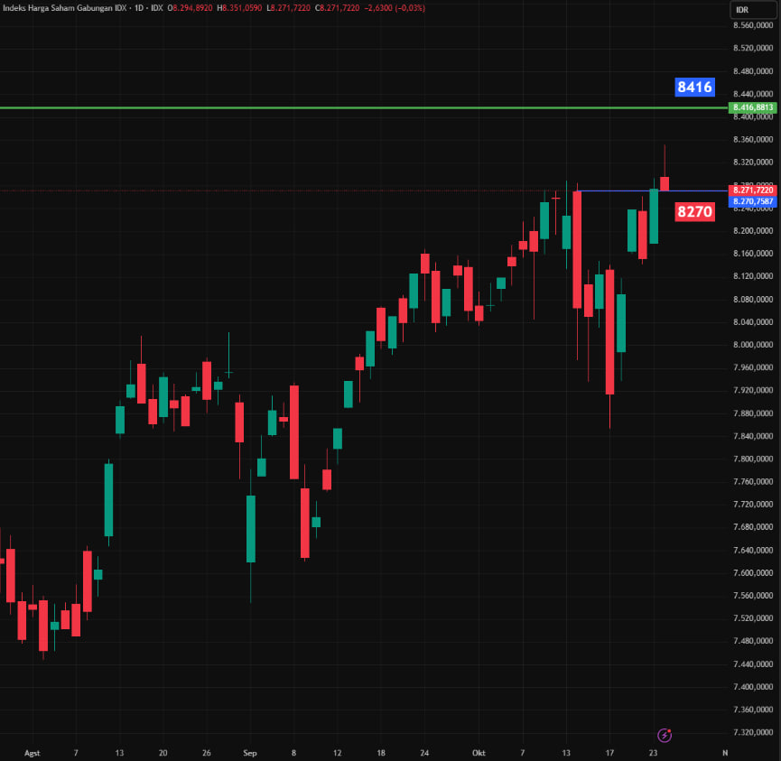 Minggu ini, IHSG berpotensi melanjutkan penguatan dengan target menuju level 8.416, didukung oleh sejumlah faktor fundamental dan sentimen positif pasar. Arus dana asing yang kembali masuk ke pasar saham Indonesia, terutama dipicu oleh siklus rebalancing indeks FTSE, turut meningkatkan permintaan terhadap saham-saham domestik. Selain itu, ekspektasi pelonggaran kebijakan moneter global, khususnya dari Federal Reserve AS, membuka peluang penurunan suku bunga acuan yang dapat meningkatkan minat investasi di pasar negara berkembang, termasuk Indonesia. Dari sisi domestik, langkah Bank Indonesia memangkas suku bunga acuan juga memberi dorongan likuiditas dan menumbuhkan optimisme pelaku pasar. Stabilitas politik pasca reshuffle kabinet turut memperkuat keyakinan terhadap konsistensi program ekonomi pemerintah. Sementara itu, optimisme terhadap peningkatan ekspor nasional melalui penyelesaian perjanjian dagang Indonesia–Uni Eropa, serta dukungan stimulus fiskal dan investasi dalam negeri, menjadi katalis tambahan bagi prospek pertumbuhan ekonomi dan pergerakan positif IHSG ke depan
