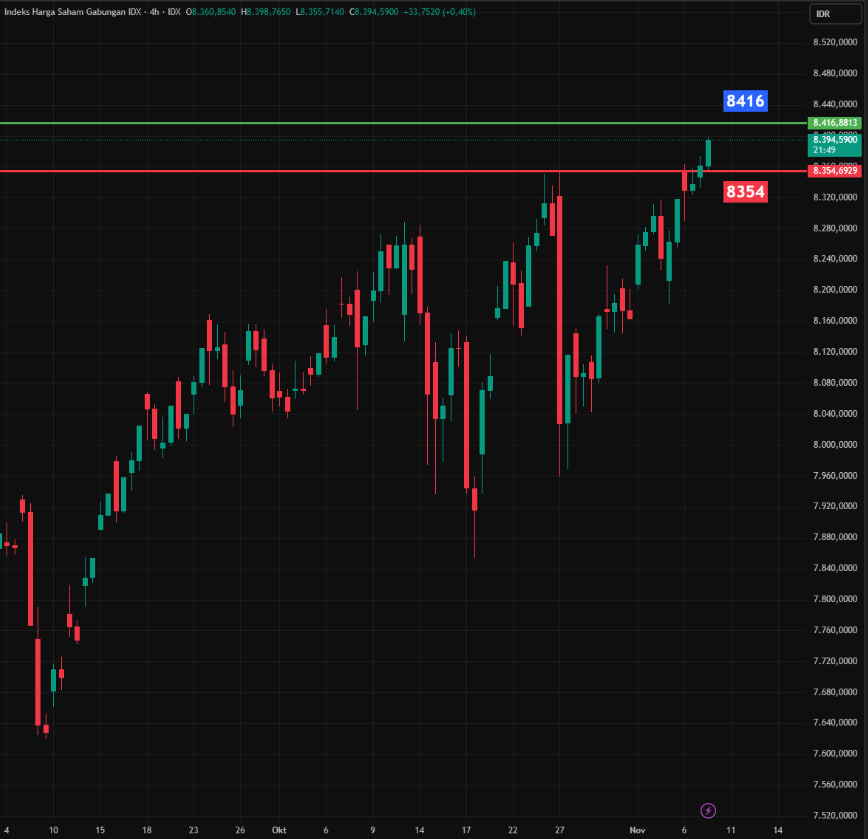 Setelah berhasil breakout dan tutup di atas resist 8354, minggu ini IHSG masih berpotensi melanjutkan penguatan dengan target 8416. Sentimen ekonomi domestik yang positif turut menopang prospek tersebut, didukung oleh data PMI manufaktur yang terus ekspansif, pertumbuhan ekonomi kuartal III yang melampaui ekspektasi, serta neraca perdagangan yang tetap mencatat surplus selama lebih dari 65 bulan berturut-turut. Stabilitas pasar obligasi nasional dan penurunan yield SBN ke level 5,9% juga meningkatkan kepercayaan investor dan memperkuat outlook pasar ekuitas. Dari sisi aliran dana, optimisme terhadap kinerja emiten besar pada kuartal IV dan respons positif atas laporan keuangan kuartal III menjadi katalis bagi minat beli, sementara dana domestik diperkirakan tetap menjadi penggerak utama seiring stabilitas makro dan potensi penurunan suku bunga BI. Secara eksternal, penguatan bursa global, terutama rebound saham teknologi di AS, menambah dukungan bagi IHSG, ditambah dengan meredanya ketegangan geopolitik dan sikap dovish The Fed yang menjaga selera risiko terhadap pasar emerging seperti Indonesia.