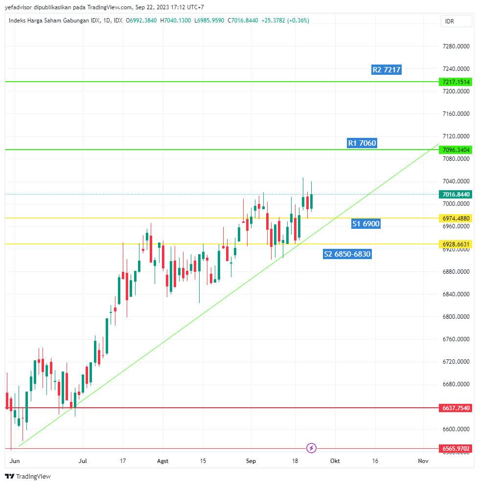 Minggu ini IHSG berpotensi melanjutkan uptrend menuju 7060 hingga 7217 dalam jangka pendek