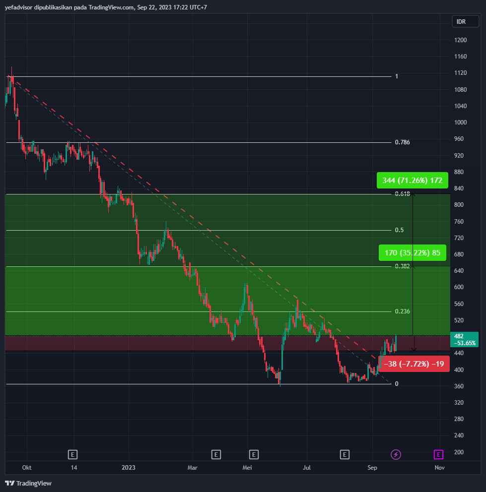 Ini adalah salah satu saham paling menarik untuk ditradingkan minggu ini. Berpotensi membentuk double bottom dan reversal dengan potensi profit minimal 35% hingga 71%. Menariknya risk dapat dibatasi hanya 7%!