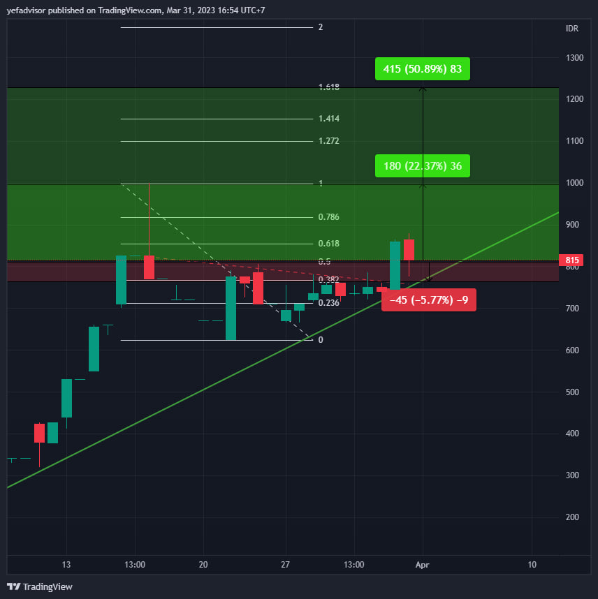 Ini adalah saham yang paling menarik untuk ditradingkan minggu ini. berhasil terkonfirmasi lanjutkan uptrend dengan potensi upside sebesar 22% hingga 50%. Selain upside yang besar, Risknya bisa dibatasi 5-6%.